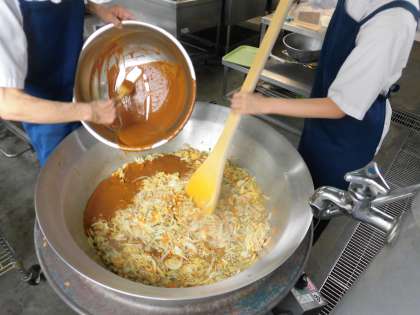 給食室では、しっかりと火を通して食中毒にならないように注意しています。食べる前には石けんを使って手を洗い、きれいなハンカチでふいて、食中毒を予防しましょう。