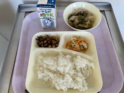 今日の給食は、豚肉とじゃがいもの煮もの、ひじき豆、ささみと野菜のごまみそ焼き、ごはん、牛乳です。