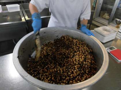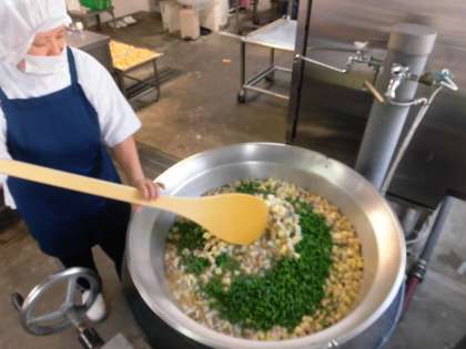 「ささみと野菜のごまみそ焼き」はささみとキャベツ、にんじん、ねりごま、砂糖、うすくちしょうゆ、白みそを混ぜ合わせ、白ごまをふって、焼き物機で焼く初めて登場する献立です。