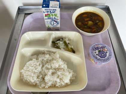 今日の給食はビーフカレーライス、野菜のピクルス、ぶどうゼリー、牛乳です。