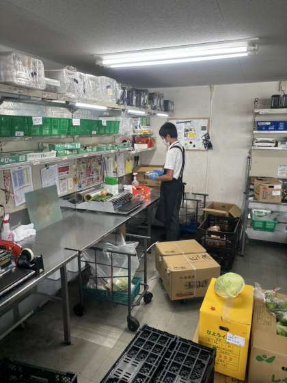 巽中学校近くのアプロでの様子です。商品を全てラベルが見えるように並べています。商品の包装も難しいようです。