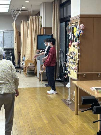 ラジオ体操第二を一緒にしています。普段の体育の授業ではラジオ体操第一なので、第二は‥でも一緒に体操は楽しそうです。