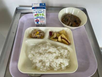 今日の給食はマーボーなす、ツナと野菜のいためもの、焼きさつまいもの甘みつかけ、ごはん、牛乳です。