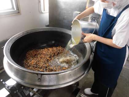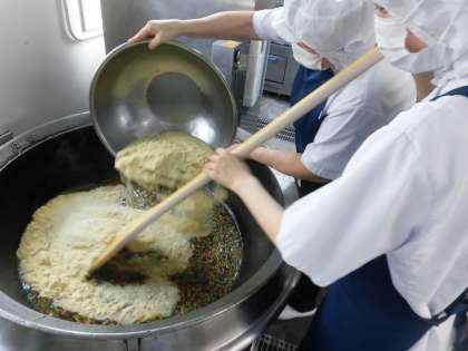 だしは、だしこんぶとけずりぶしでとっています。今日は、「五目汁」と「高野どうふのいり煮」に、このだしを使っています。