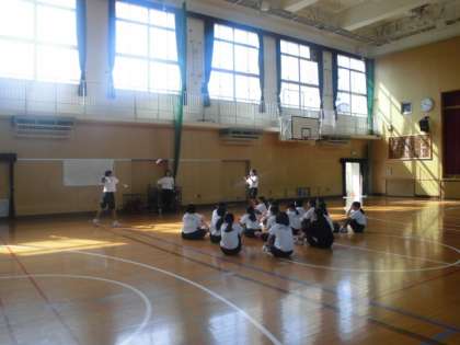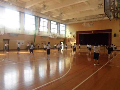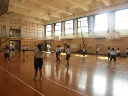 水泳の授業が終わり、新たな単元が始まりました。女子はバスケットボールをしています。まずは、基本的なパスを練習しています。