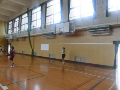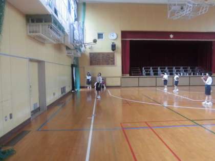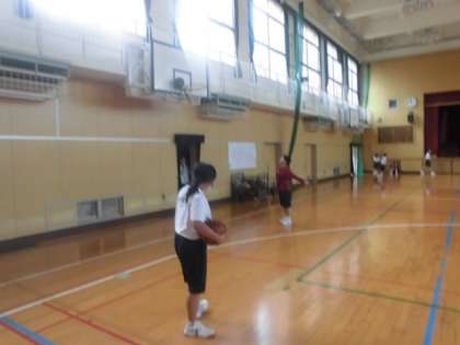 女子は体育館でバスケットボールをしています。レイアップシュートの練習をしています。