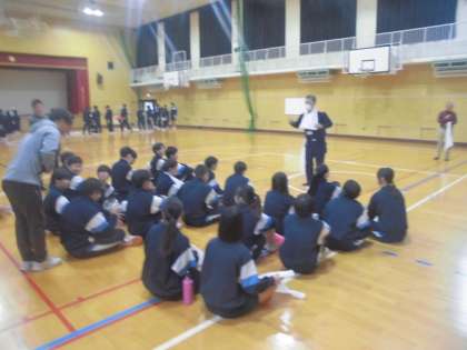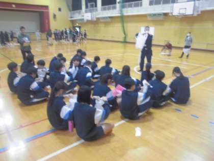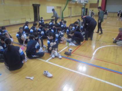 3年生は、各グループに分かれて活動をします。三角巾やビニール袋を使っての応急処置の仕方について学んでいます。