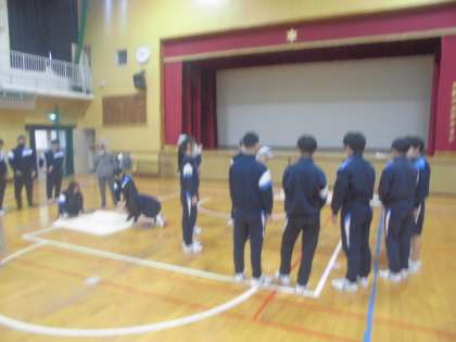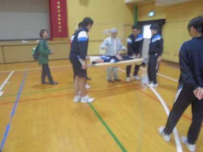 毛布を使って担架をつくり、搬送訓練を行っています。実際に覚えておくと、いざという時に役立ちますね。