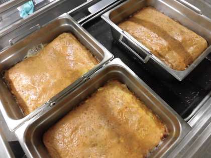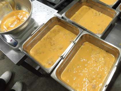 給食のツナポテトオムレツは、卵、ツナ、じゃがいもをミニバットに入れて、焼き物機で蒸し焼きにしています。