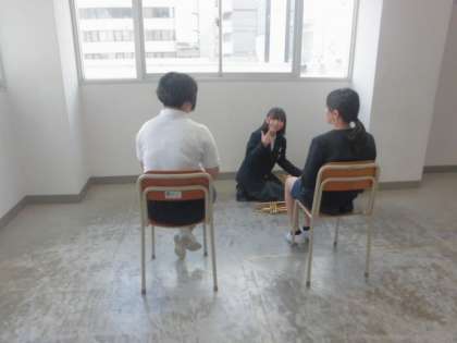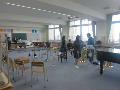 吹奏楽部の様子です。楽器の吹き方について、先輩が教えています。