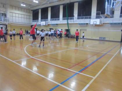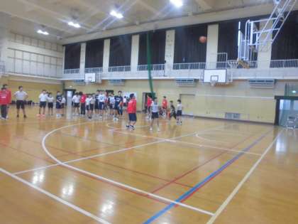 男子バスケットボール部の様子です。オフェンスとディフェンスに分かれて、シュート練習をしています。