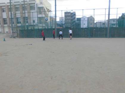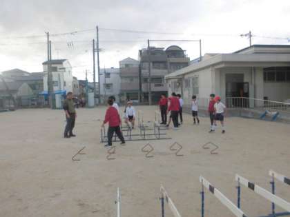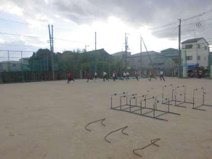 陸上部の様子です。ハードルを使ったトレーニングをしたり、大きなボールを使ったトレーニングをしたりしています。