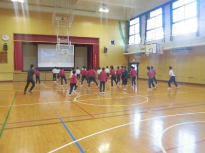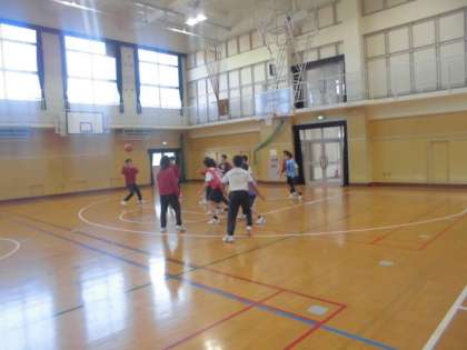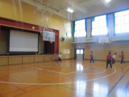 男子は体育館でバスケットボールをしています。アップでは、先日習ったダンスを2回踊りました。チームでドリブルリレーをした後に、シュート練習をして最後に試合をしました。
