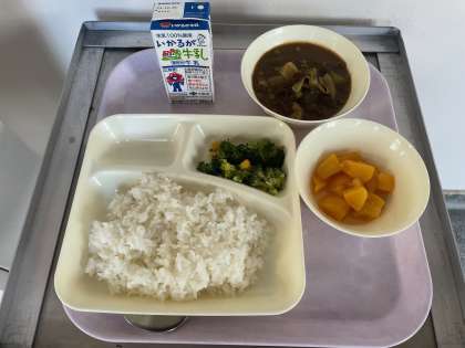 冬野菜のカレーライス、ブロッコリーとコーンのサラダ、黄桃(カット缶)、牛乳です。