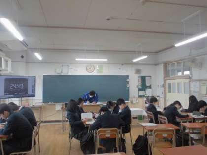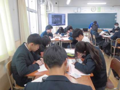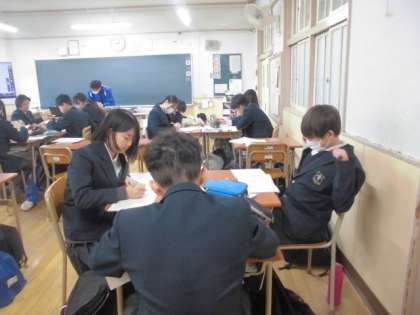 チャレンジテストに向けての対策プリントをしています。グループでお互い教えあっています。