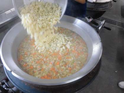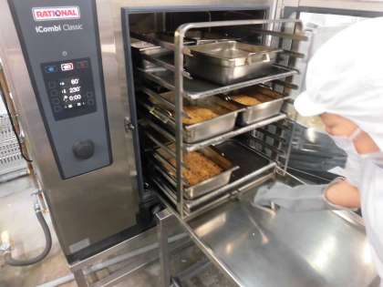 「とうふローフ」は、ツナ、とうふ、細かくカットした大豆、たまねぎ、でん粉を混ぜ合わせ、砂糖、塩、こいくちしょうゆで味つけし、焼き物機で焼いています。
