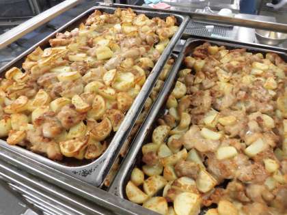・鶏肉とじゃがいものガーリック焼き ・スープ煮 ・ブロッコリーのサラダ ・コッペパン ・みかんジャム ・牛乳 です。