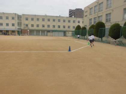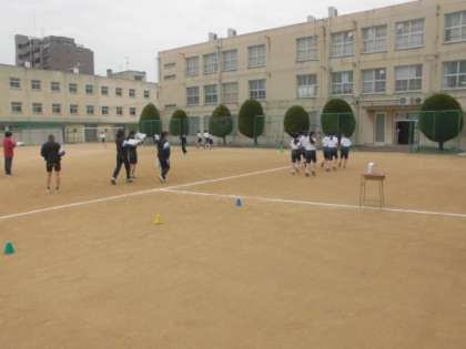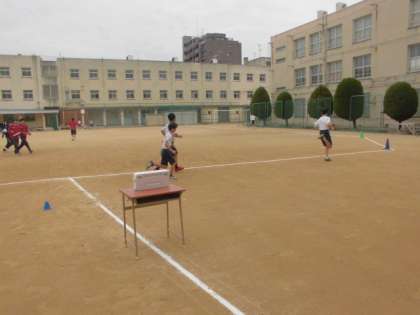 今日は1000m走の1回目です。ペアの人がタイムを見ながら、ペアの人のペース配分についてアドバイスをしています。