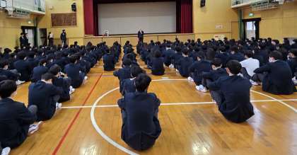 全校集会では、男子バスケットボール部が大阪府大会で優勝をし、表彰式が行われました。