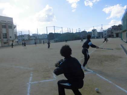 今日は風も強く吹いていて、運動場はとても寒いですが、大きな声を出しながら、元気にソフトボールをしていました!