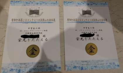 今日の管弦打楽器ソロコンテスト大阪府大会(@大阪狭山市文化会館)では、日頃の練習の成果を発揮し、2人とも『金賞』を受賞することができました!!