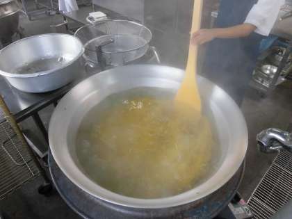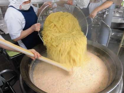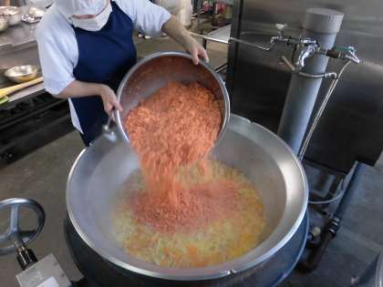 紅ざけ(フレーク)を使って、春らしい淡いピンク色に仕上げ、むきえだまめで彩りを良くしています。小麦粉と綿実油でホワイトルウを作り、クリームとチキンブイヨンで旨みを加えます。