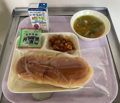 今日の給食はおさつパン、牛乳、じゃがいものミートグラタン、レタスのスープ、ソフト黒豆です。