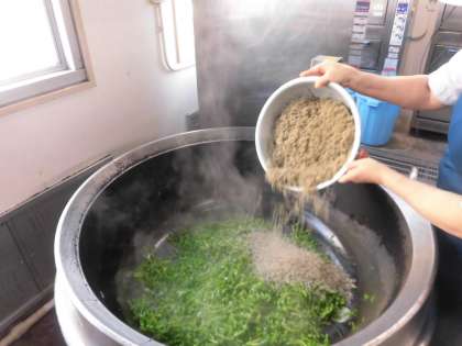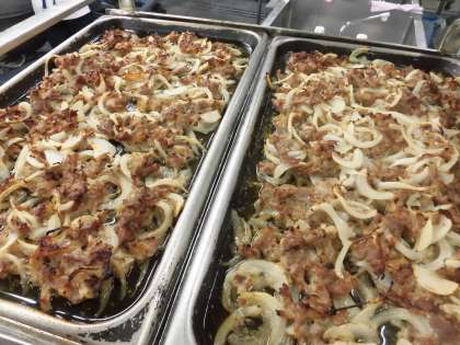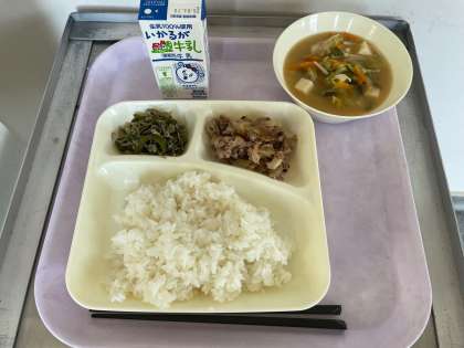 今日の給食はごはん、牛乳、豚肉のしょうが焼き、とうふのみそ汁、じゃこピーマンです。