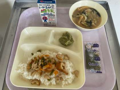 今日の給食は、かやくご飯【きざみのり】、みそ汁、まっ茶ういろう、牛乳です。