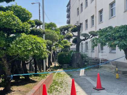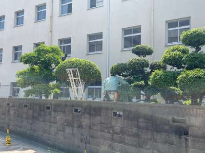 校園営繕園芸事務所の園芸班(5名)が今日から3日間、巽中学校の剪定作業を管理作業員さんと一緒に行っています。