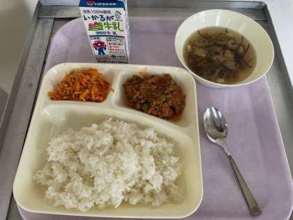 今日のメニューはタコライス、とうふともずくのとろり汁、にんじんんしりしり風、牛乳です。