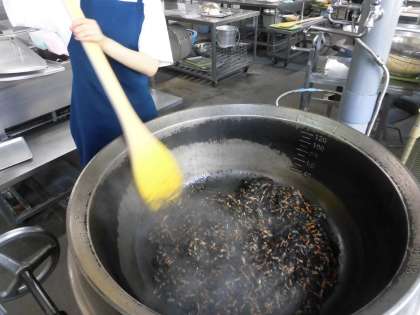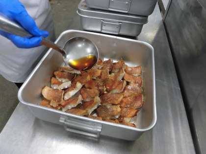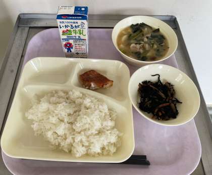 今日の給食は、あかうおのしょうゆだれかけ、みそ汁、ひじきのいため煮、ごはん、牛乳です。