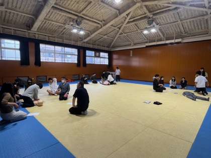 心肺蘇生の一連の流れを映像と実技で確認し、各学年に分かれて実技練習を行い、いざと言う時のために備えています。