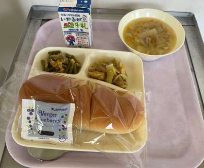 今日の給食はコッペパン、鶏肉のカレー風味焼き、スープ、ツナとサンドマメのソテー、ブルーベリージャム、牛乳です。
