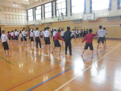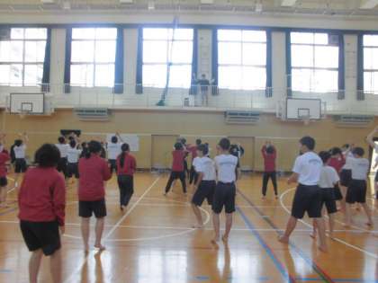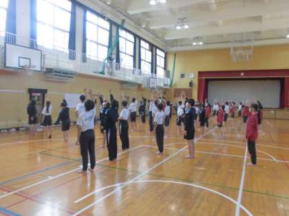 今日は学年全体での練習です。途中の位置移動の確認を行っています。