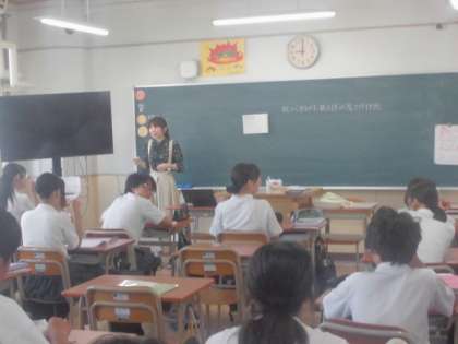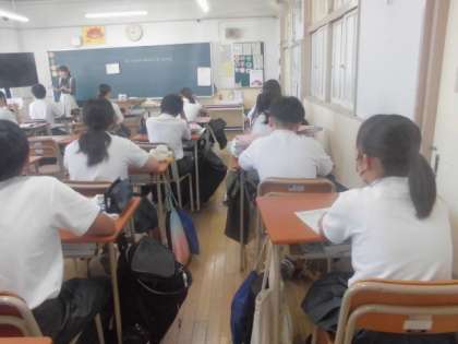 夏休みの宿題についての説明を受けています。1冊といわず、たくさん本を読みましょう!