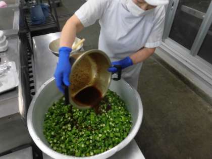 ・鶏肉と一口がんもの煮もの ・オクラの梅風味 ・ツナっ葉いため ・ごはん ・牛乳 です。