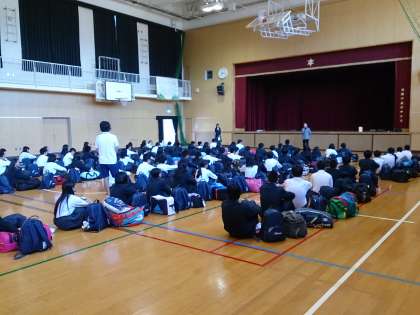 体育館で行われた修学旅行出発式の様子です。
