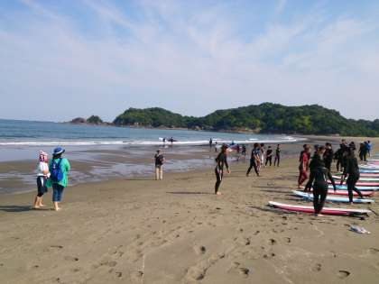 体験活動が始まりました。写真は生見海岸でのサーフィン体験の様子です。天候にも恵まれ、水温も低くなく、快適な体験となりました。