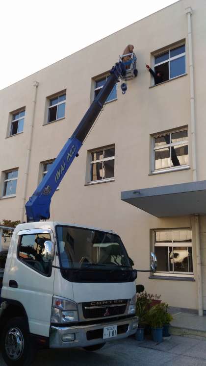正門前懸垂幕の工事が始まりました。