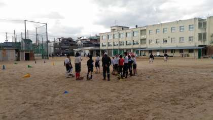 昨日の雨で、グランドは少しぬかるんでいますが、みんな元気に体験しています。