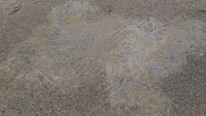 朝からの冷え込みで、グランドの水たまりに氷が張っていました。