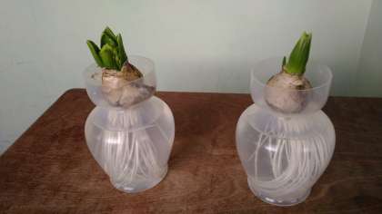 学級のヒヤシンスが少しずつ成長しています。