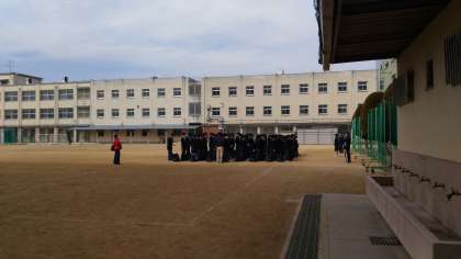 13時30分、生徒たちは、大阪市中央体育館から学校に戻りました。運動場で整列しています。
