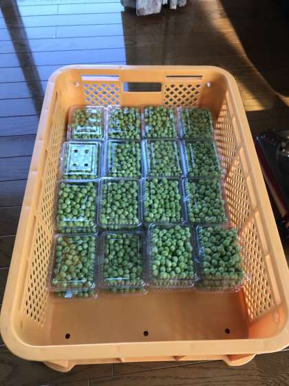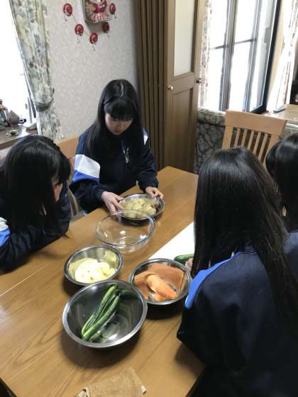 写真はえんどう豆のパック詰めとポテトサラダ作りの様子です。