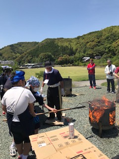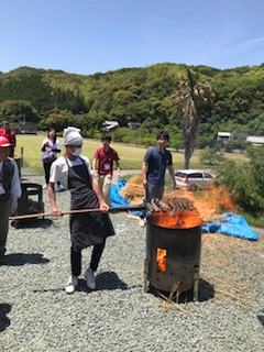 短冊に切ったカツオを藁であぶっている様子です。