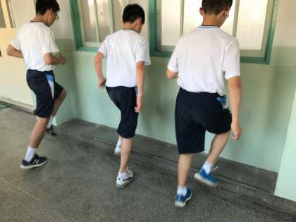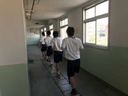 巽中学校の陸上部は現在35名で活動しています。運動場で活動が出来ない時は、格技室や校舎内を使い工夫して練習に取り組んでいます。