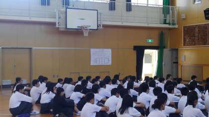本日の学活で1年生の一泊移住の説明会をしました。 写真はカッター研修の説明の様子です。