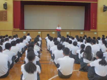 ・「知覧特攻平和会館」の展示、小説「あの花が咲く丘で君とまた出会えたら」をからめた平和についてのお話がありました。みなさんには友達を大切にすることや相手の立場を考えて言葉を選ぶなど、「自分にできる平和の形」を考えて欲しいと思います。