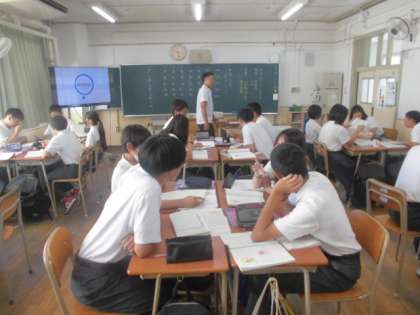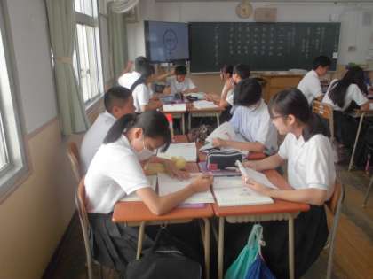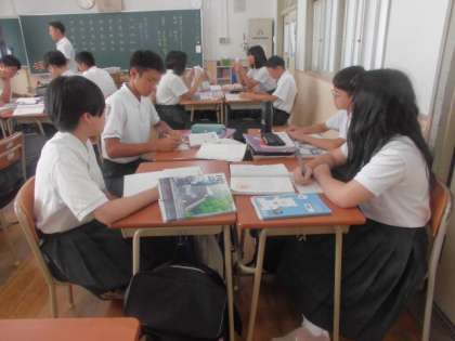 「味は味覚だけでは決まらない」という文章を読んで、「聴覚」や「視覚」なども影響することを考えています。グループで話し合いをし、最後は自分の意見をまとめます。